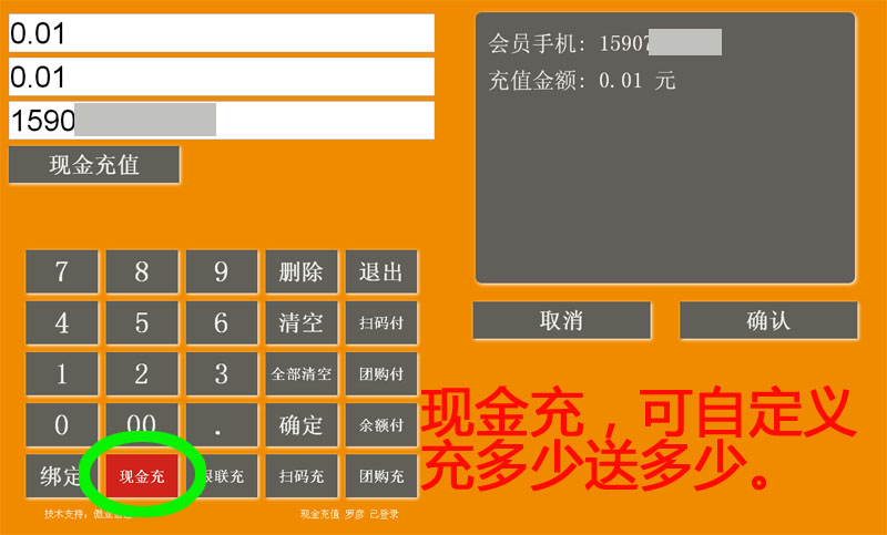 收到会员现金——》点现金充——》输入充值金额——再次输入充值金额(两次必须一致)——》输入会员手机号(必填)——》充值——》