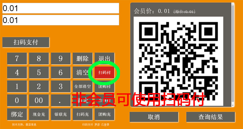 点扫码付——》输入2遍订单金额——》扫码支付——》右边生成二维码——》客户用微信扫二维码支付——》支付成功——》客户收到微信消息提醒。
