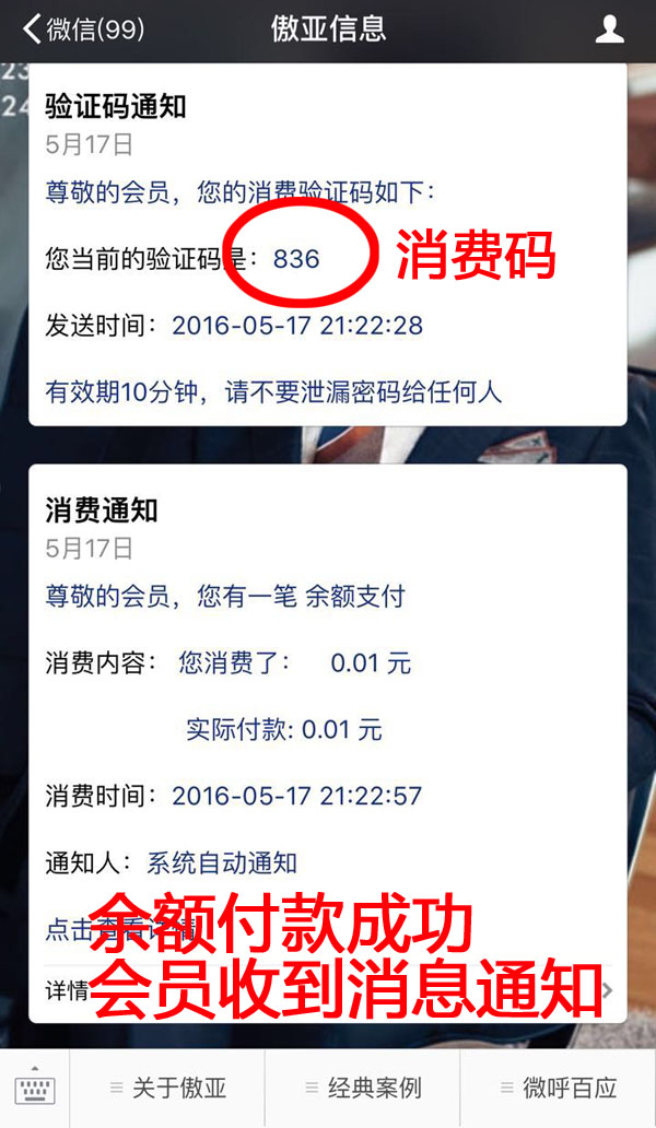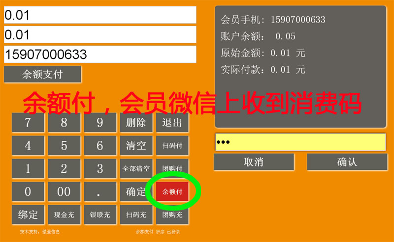 点余额付——》输入订单金额——再次输入订单金额(两次必须一致)——》输入会员手机号(必填)——》余额支付扣款成功——》会员微信上收到消息提醒