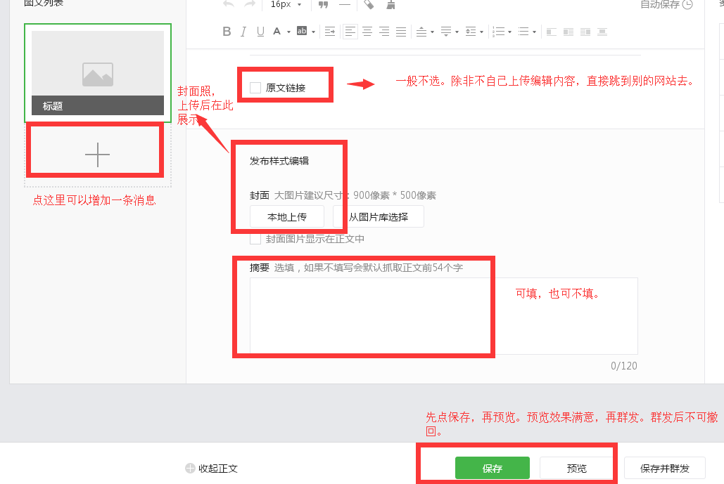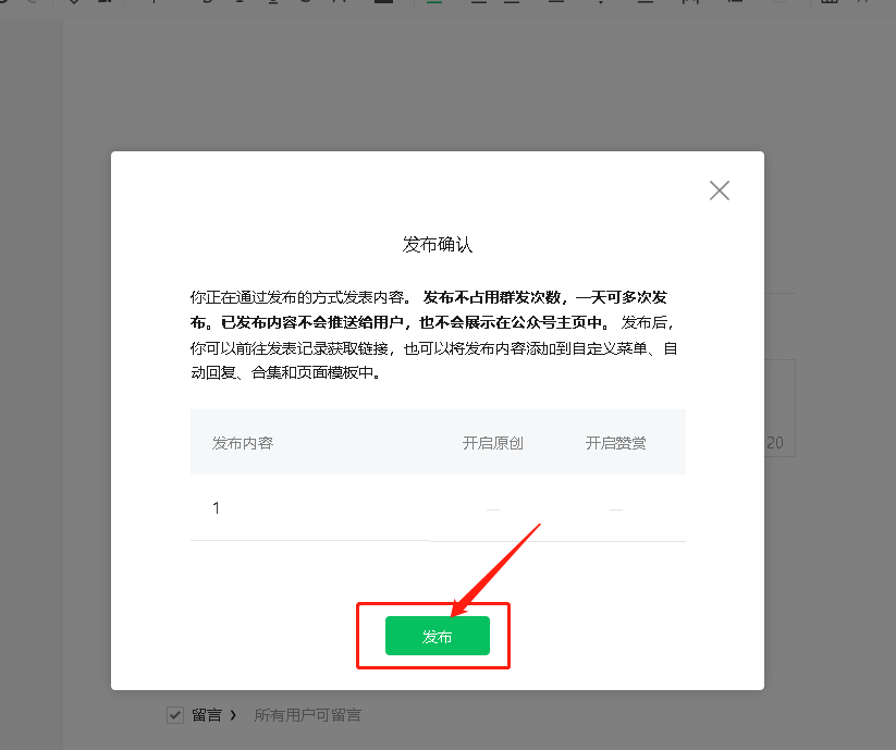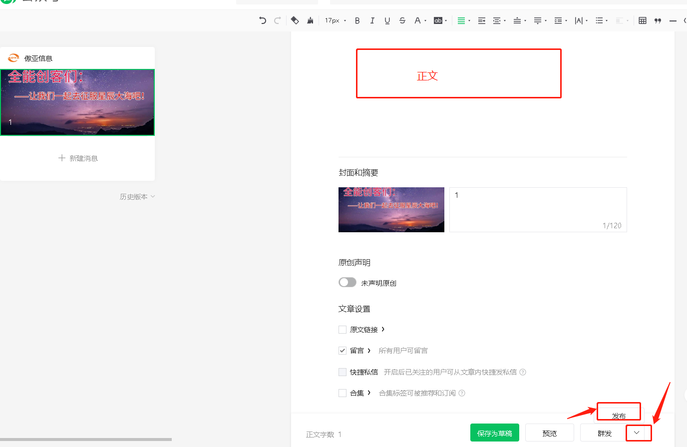 按以上方式编辑好文章后,点击群发按钮旁边的箭头图标——点击发布,可获得永久链接