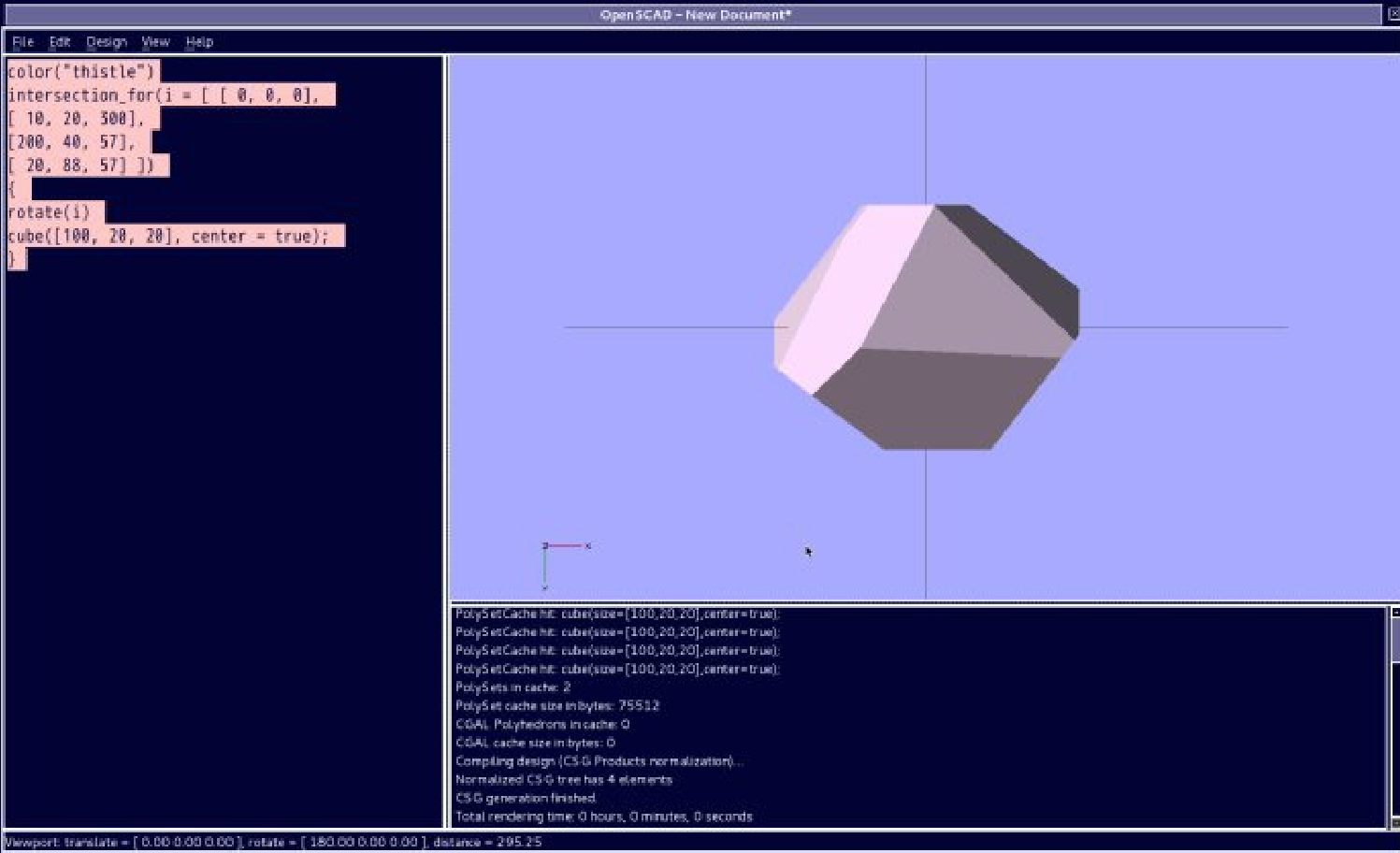 实例 2 – 循环通过一个数组 - 旋转: color("thistle") intersection_for(i = [ [ 0, 0, 0], [ 10, 20, 300], [200, 40, 57], [ 20, 88, 57] ]) { rotate(i) cube([100, 20, 20], center = true); }