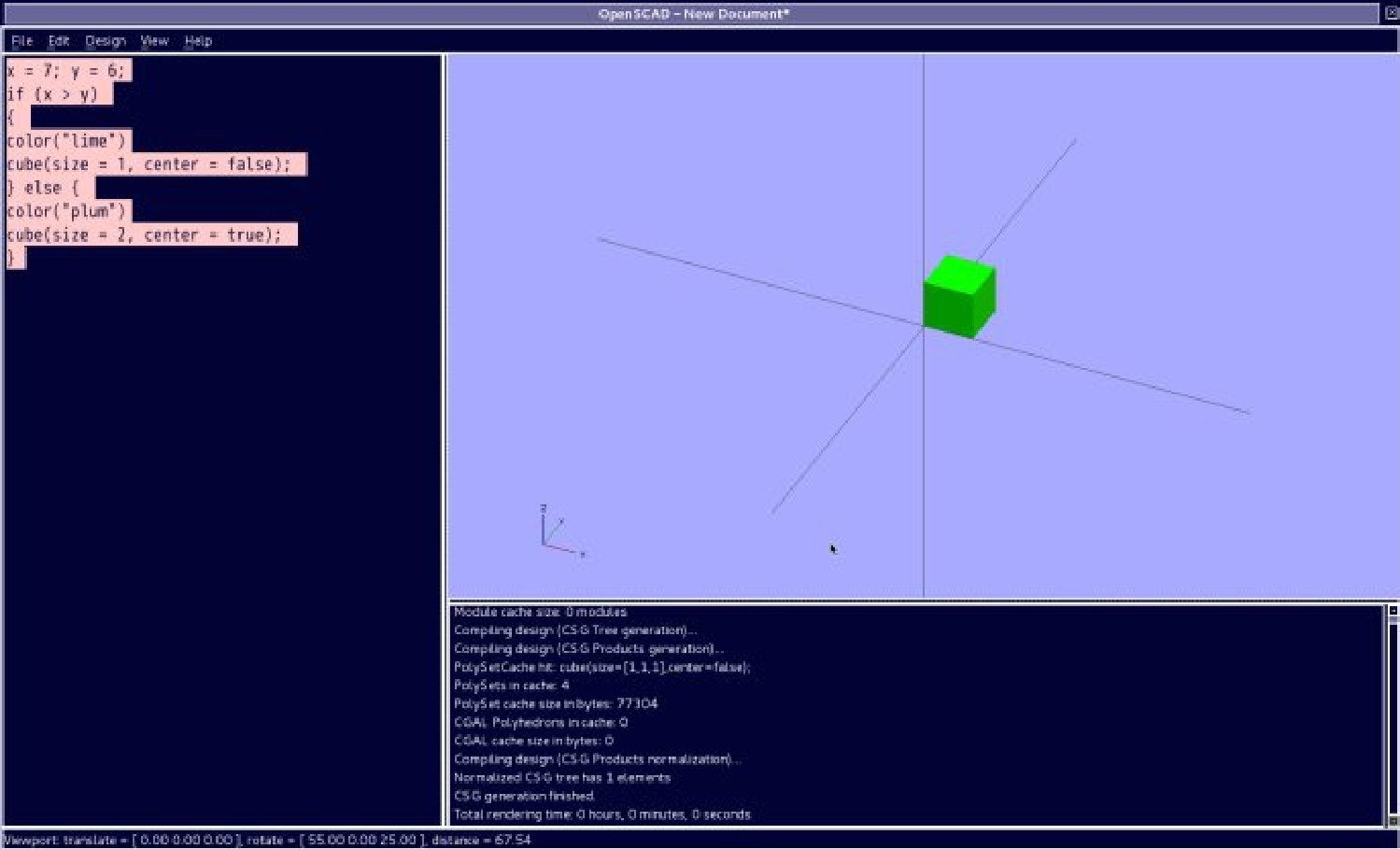实例: x = 5; y = 6; if (x > y) { color("lime") cube(size = 1, center = false); } else { color("plum") cube(size = 2, center = true); }
