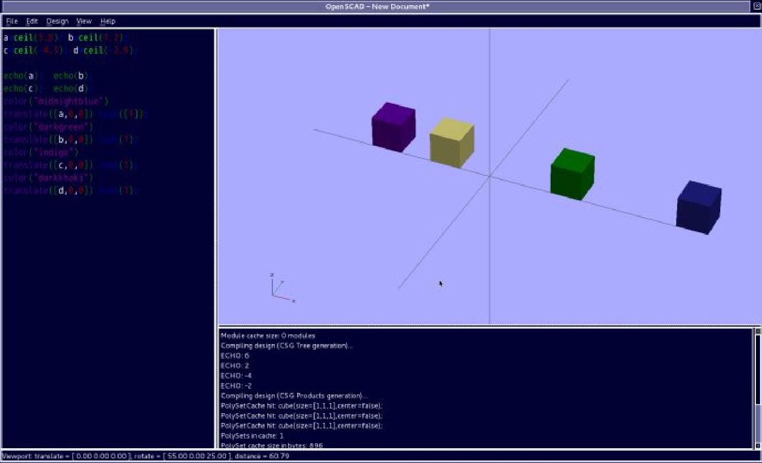 在 openSCAD 中,应用是一样的,不过这里的显示是用了 echo, 终端 BASH 命令,和在 BASH 编程语言中和 printf 的意思是一样的,而在计算机图形学中,是立即显示计算的数值, openSCAD 应该是这一类的。实例中, a=ceil(5.8); b=ceil(1.2); c=ceil(-4.3); d=ceil(-2.9); 得到的实际输出是a=6,b=2,c=-4,d=-2. 和 C 语言中计算的一样。