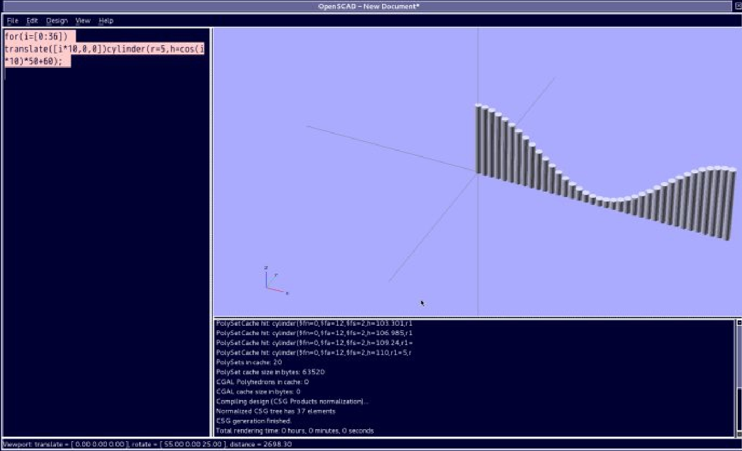 实例: for(i=[0:36]) translate([i*10,0,0])cylinder(r=5,h=cos(i*10)*50+60);