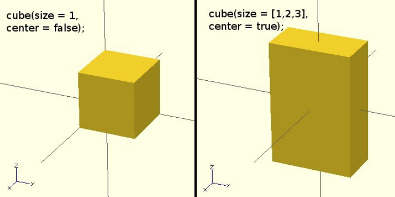 cube(size = 1, center = false); cube(size = [1,2,3], center = true);