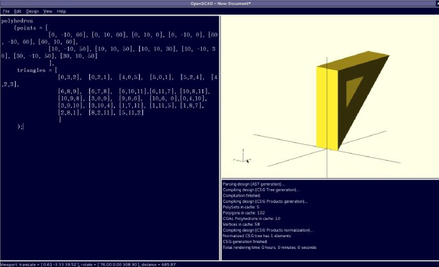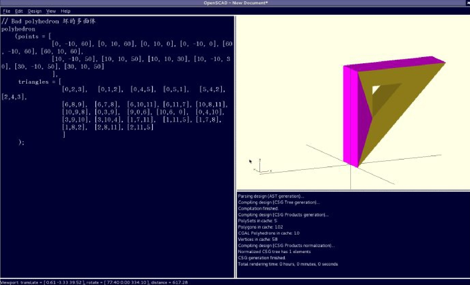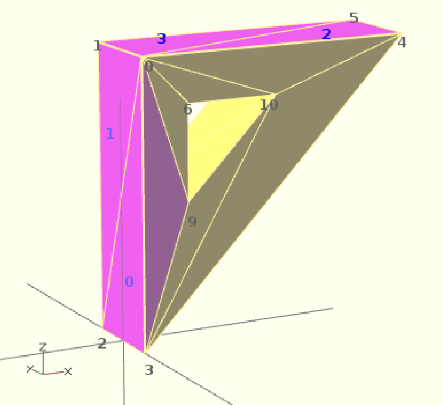 三 角点排序:当看到外边向内的面,这个点必须是顺时针。你可以从新安排次序关于点或者次序参照每一个三角的其他三位数坐标组合。三角的排序是无形的。注意你 的多面体不是左右方向都是一样的,OpenSCAD将会同时显示一个错误或者彻底崩溃,所以特别注意顶点的排序。还有,记住那个‘ pN' 组件冠以三角数组 0 基数参考的点数组组件。