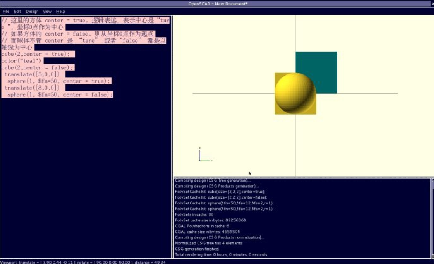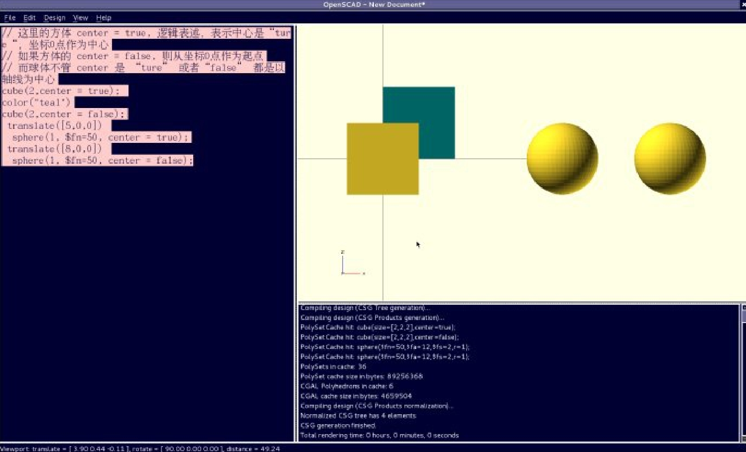 // 这里的方体 center = true, 逻辑表述,表示中心是“ ture“ ,坐标 0 点作为中心 // 如果方体的 center = false, 则从坐标 0 点作为起点 // 而球体不管 center 是 “ ture” 或者“ false” 都是以轴线为中心 cube(2,center = true); color("teal") cube(2,center = false); translate([5,0,0]) sphere(1, $fn=50, center = true); translate([8,0,0]) sphere(1, $fn=50, center = false);