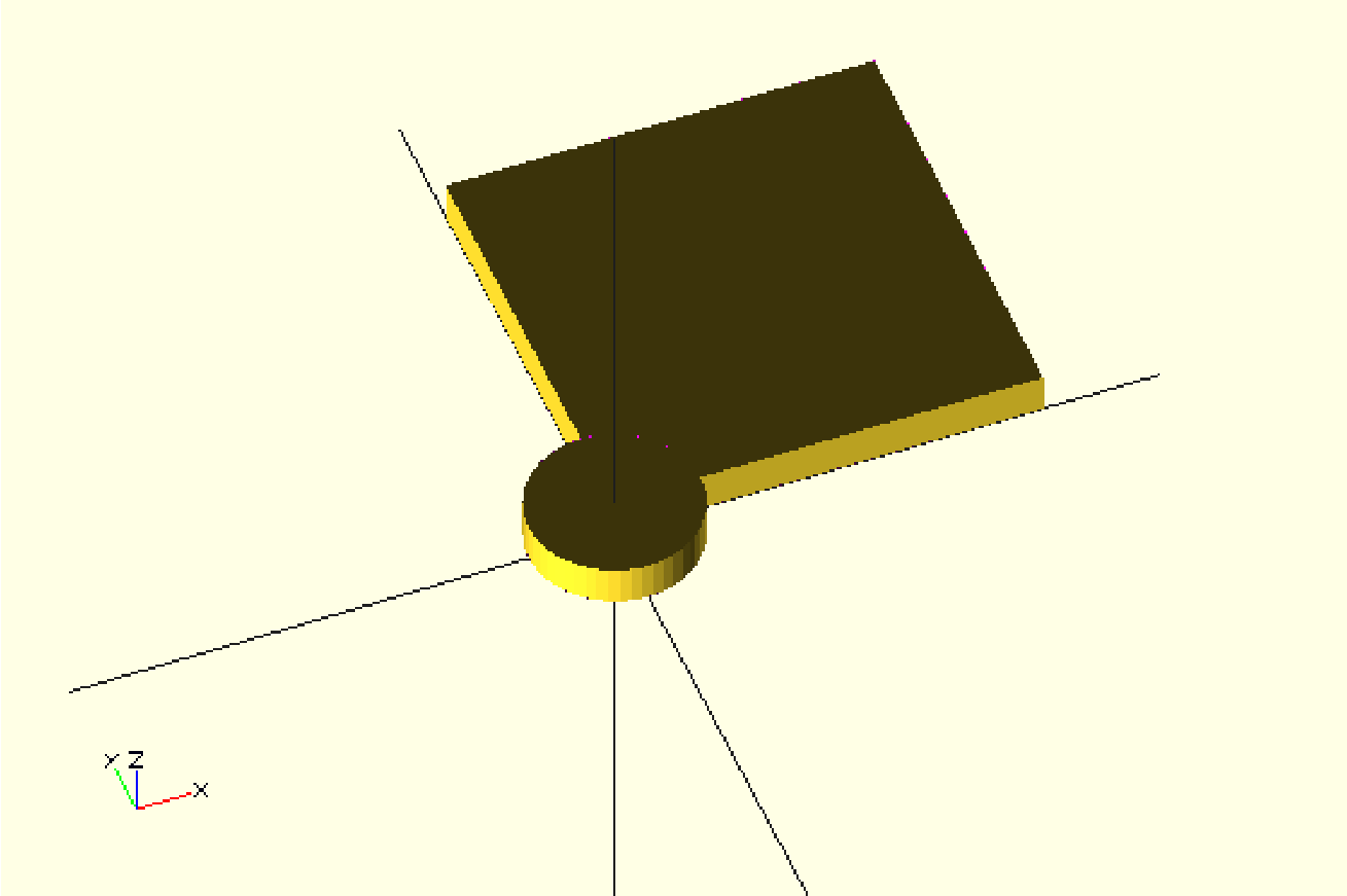 //first $fn=50; cube([10,10,1]); cylinder(r=2,h=1);