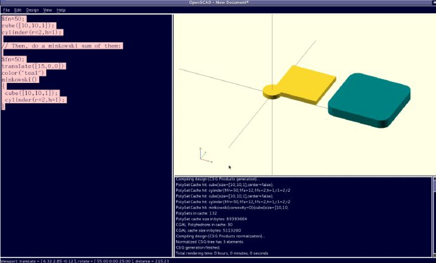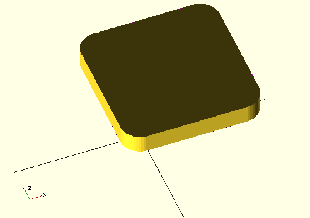$fn=50; cube([10,10,1]); cylinder(r=2,h=1); Then, do a minkowski sum of them: $fn=50; minkowski() { cube([10,10,1]); cylinder(r=2,h=1); }