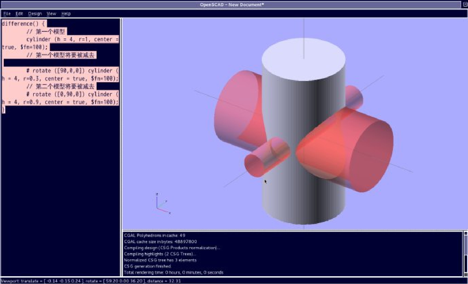 difference() { // start objects cylinder (h = 4, r=1, center = true, $fn=100); // first object that will subtracted # rotate ([90,0,0]) cylinder (h = 4, r=0.3, center = true, $fn=100); // second object that will be subtracted # rotate ([0,90,0]) cylinder (h = 4, r=0.9, center = true, $fn=100); }