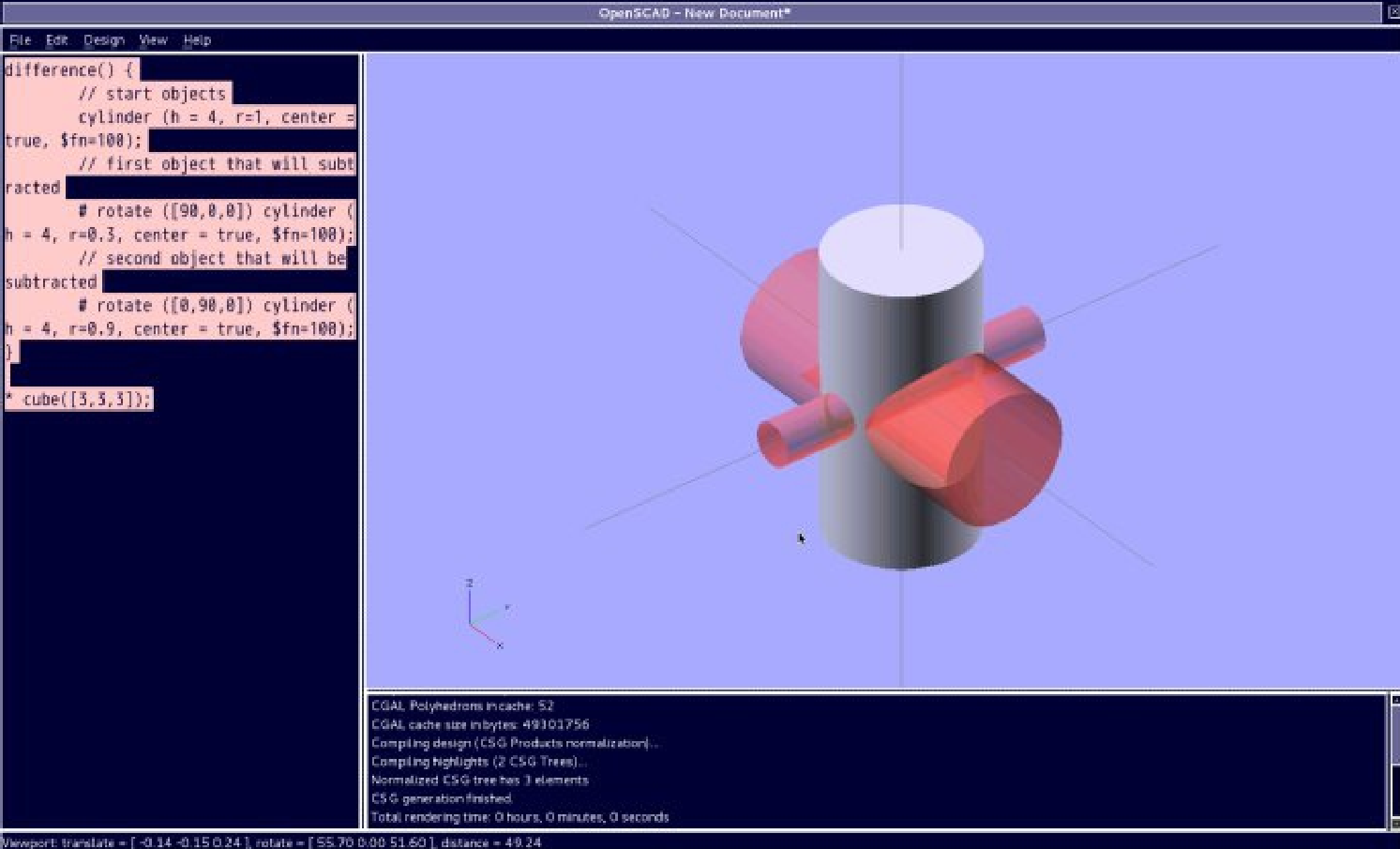 difference() { // start objects cylinder (h = 4, r=1, center = true, $fn=100); // first object that will subtracted # rotate ([90,0,0]) cylinder (h = 4, r=0.3, center = true, $fn=100); // second object that will be subtracted # rotate ([0,90,0]) cylinder (h = 4, r=0.9, center = true, $fn=100); } * cube([3,3,3]);