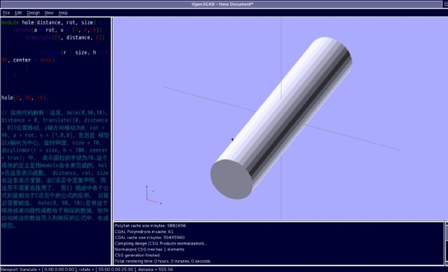 这个模块的定义是用 module 命令来完成的, hole 在这里表示函数, distance, rot, size 在这里表示变量,在 C 语言中需要声明,而这里不需要直接用了, 而 {} 描述中各个公式则是相当于 C 语言中的公式的应用, 后最后需要赋值, hole(0, 90, 10); 是将这个模块或者功能性函数给于相应的数值,软件自动将这些数值导入到相应的公式中,生成模型。