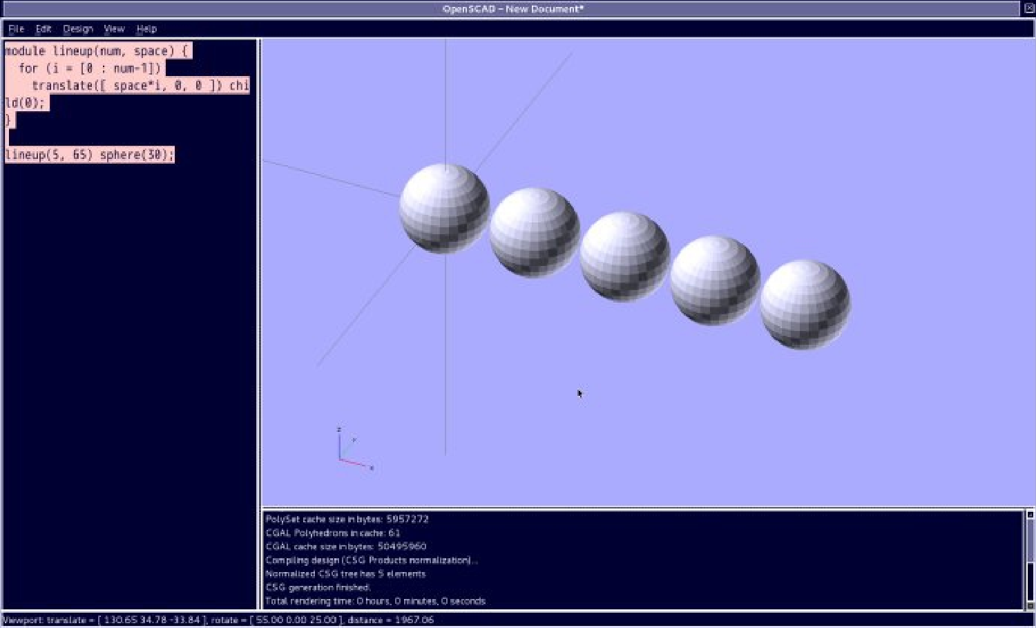 lineup(5, 65) sphere(30);