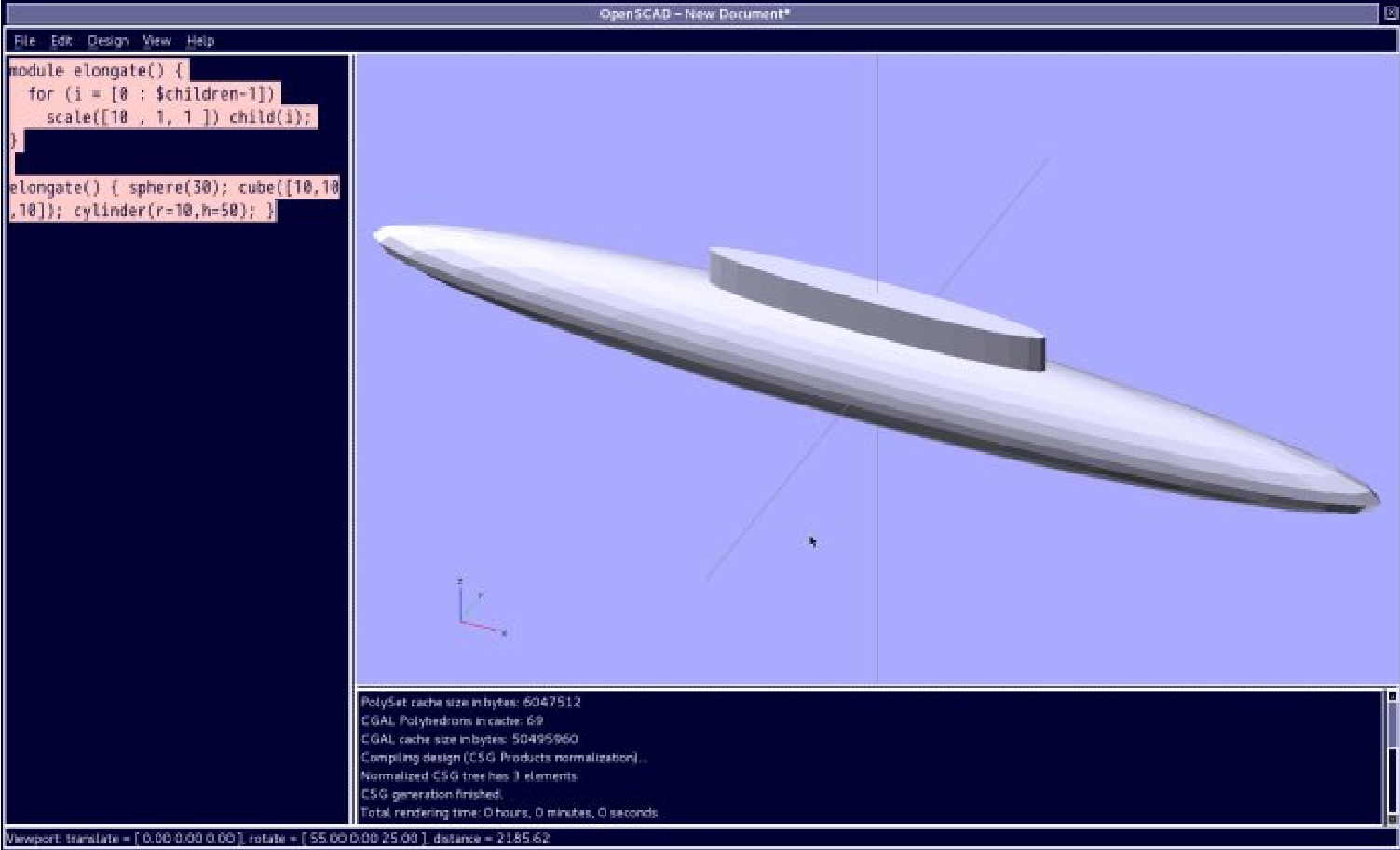 elongate() { sphere(30); cube([10,10,10]); cylinder(r=10,h=50); }