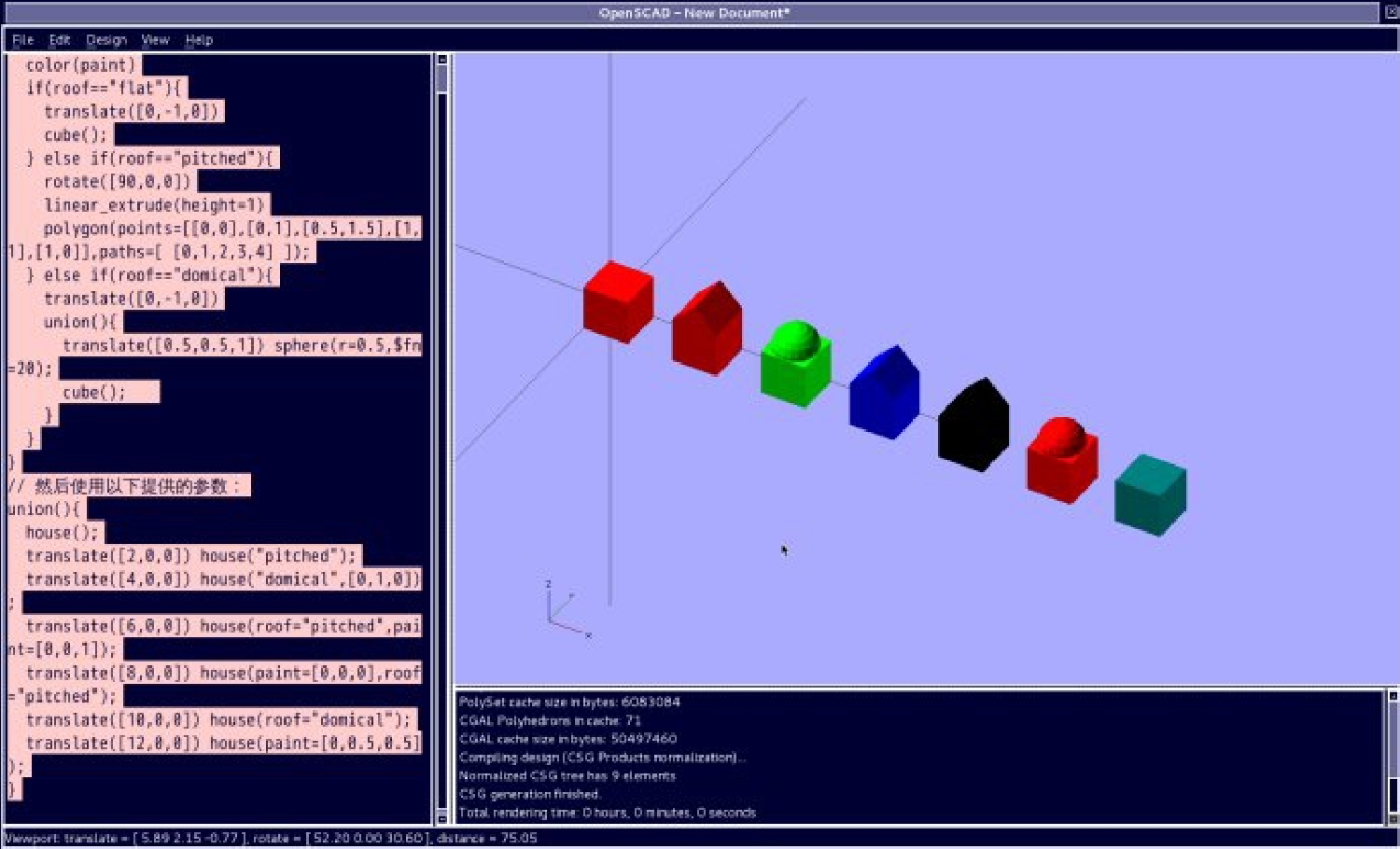 translate([12,0,0]) house(paint=[0,0.5,0.5]);
