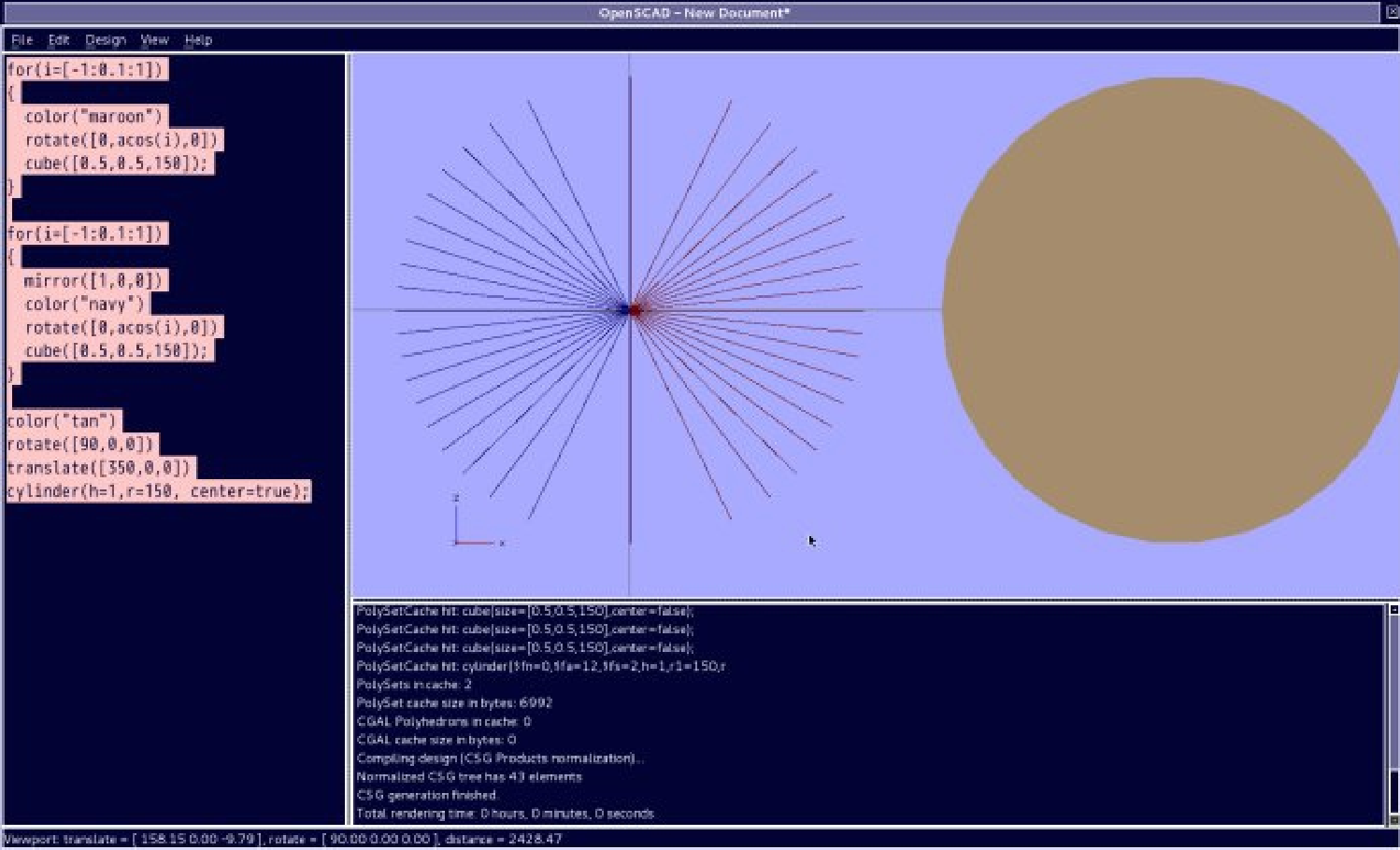 这里,我们用立方体 [0.5,0.5,150]( 相当于一个直线) , 循环 -1 到 1 ,增量为 0.1 (之后分别用不同的密度 0.01 , 0.001 ), 使用 acos 函数计算出不同角度,做一个( -1 到 1 的角度只有 180 度,半个圆形 , 使用 mirror 命令才能完成整个圆形;也可循环从 0 到 1 ,增量 0.1 ,利用 rotate 完成整个圆形 ) 等分圆形,根据循环的密度,确定这个圆形的精度。