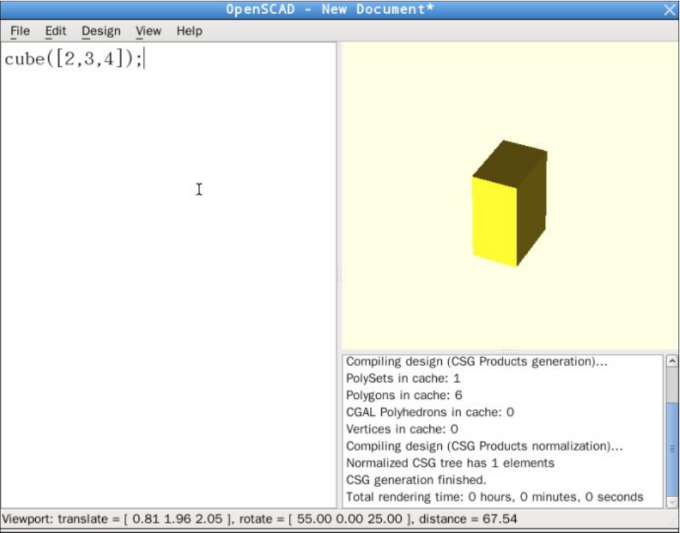 菜单栏: File, Edit, Design, View, Help 文件,编辑,设计,查看,帮助 左侧的编辑器,是 openSCAD 语言代码编辑的区域。 右侧上面的大块区域是图像模型生成区域。 右侧下部小块是系统编译源代码语言的状态信息。 最底下的状态栏,显示当前的视图角度和一些信息。